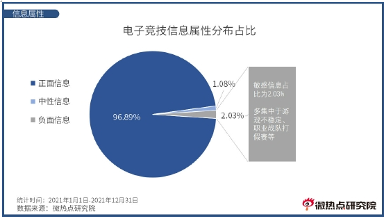 在統(tǒng)計(jì)時(shí)間段內(nèi),電競(jìng)正面信息比為96.89%,負(fù)面信息僅有2.03%。負(fù)面信息主要集中在“LDL再出假賽事件”“Bo因打假賽被禁賽四個(gè)月”“QG因消極比賽被罰100萬(wàn)”“王者榮耀崩了”“王者榮耀口令紅包用詞不當(dāng)”等相關(guān)信息的傳播。