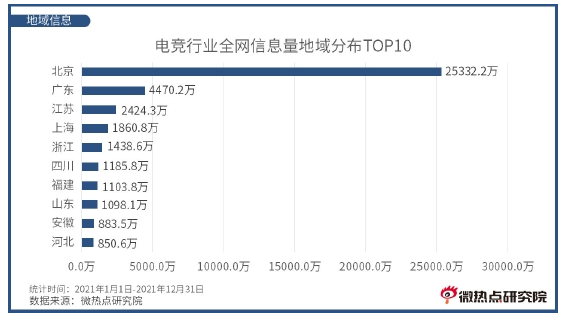 2021年,北京市電競(jìng)相關(guān)信息最多,高達(dá)2.53億條,遙遙領(lǐng)先排名第二的廣東省。經(jīng)分析,2021年北京市出臺(tái)多項(xiàng)政策,推動(dòng)當(dāng)?shù)仉娮痈?jìng)技的發(fā)展,RNG、JDG、TS、WB等多個(gè)電競(jìng)俱樂(lè)部坐落北京,為北京貢獻(xiàn)較多的信息量。江蘇、上海、浙江、福建、山東等地網(wǎng)民也較為關(guān)注相關(guān)電競(jìng)賽事、電競(jìng)基地及電競(jìng)政策等方面信息。