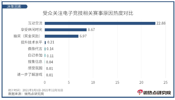 “互動(dòng)交流”“享受休閑時(shí)光”“抽獎(jiǎng)”“提升技術(shù)水平”等都成為電競(jìng)用戶(hù)觀(guān)賽理由,其中“互動(dòng)交流”成為用戶(hù)關(guān)注賽事的首要因素,社交帶動(dòng)電競(jìng)賽事的關(guān)注度進(jìn)一步提升?!跋硎苄蓍e時(shí)光”和“抽獎(jiǎng)”分別以8.67和6.97的熱度指數(shù)排在榜單第二、第三位,賽事的休閑娛樂(lè)屬性也是吸引用戶(hù)觀(guān)看的主因之一。