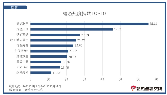 經(jīng)微熱點(diǎn)研究院統(tǒng)計(jì),2021年全年,《英雄聯(lián)盟》以65.62的熱度指數(shù)登上端游熱度榜榜首,《穿越火線(xiàn)》以45.71的熱度指數(shù)位列第二,《夢(mèng)幻西游》和《地下城與勇士》分列第三、第四位?!妒赝蠕h》《劍俠情緣3》《絕地求生》《魔獸世界》《CS:GO》《永劫無(wú)間》分別位列五至十位。值得注意的是,端游熱度TOP10中只有《永劫無(wú)間》一款游戲是2021年新上線(xiàn)的,可見(jiàn)用戶(hù)對(duì)其的喜愛(ài)程度。
