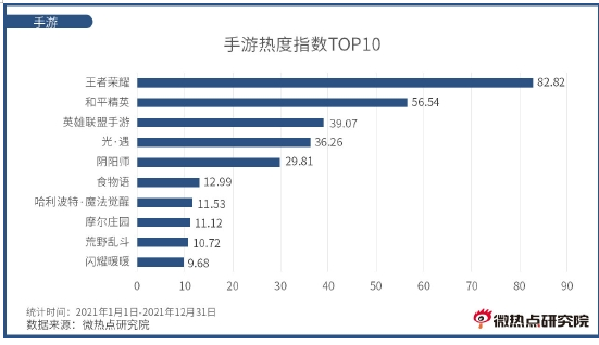 2021年度,《王者榮耀》以82.82的絕對(duì)優(yōu)勢(shì)雄踞手游熱度榜榜首?!逗推骄ⅰ芬?6.54的熱度指數(shù)位列第二。2021年新上線(xiàn)的《英雄聯(lián)盟手游》備受關(guān)注,以39.07的熱度指數(shù)位列第三。同年發(fā)售的《哈利波特·魔法覺(jué)醒》和《摩爾莊園》分別以11.53和11.12的熱度指數(shù)位列榜單第七、第八位,表現(xiàn)良好。