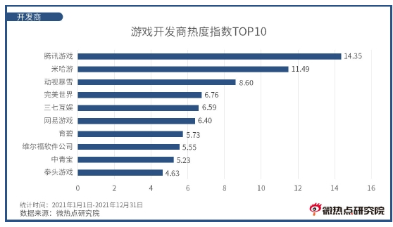 根據(jù)微熱點(diǎn)研究院對(duì)游戲廠(chǎng)商的熱度指數(shù)統(tǒng)計(jì),騰訊游戲以14.35的熱度指數(shù)成為2021年最熱游戲開(kāi)發(fā)商。出品《崩壞3》《原神》等人氣游戲的米哈游以11.49的熱度指數(shù)緊追其后。出品《魔獸系列》《爐石傳說(shuō)》《守望先鋒》等高品質(zhì)游戲的動(dòng)視暴雪位列第三位,熱度指數(shù)為8.60。完美世界、三七互娛、網(wǎng)易游戲、育碧、維爾福軟件公司、中青寶、拳頭游戲等分列四至十位。