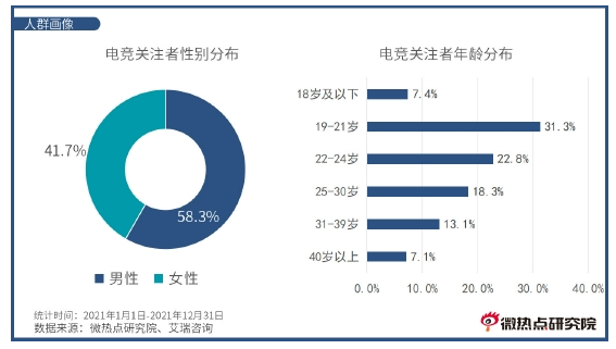 2021年,電競(jìng)?cè)臃劢z男性占比近六成,整體關(guān)注者呈現(xiàn)年輕化特征,其中,19-24歲的電競(jìng)用戶(hù)占比54.1%,25-30歲的電競(jìng)用戶(hù)占比18.3%,18歲及以下的電競(jìng)用戶(hù)占比7.4%,整體用戶(hù)呈現(xiàn)年輕化特征。