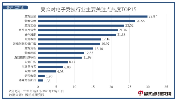 根據(jù)受眾對(duì)電競(jìng)行業(yè)主要關(guān)注點(diǎn)進(jìn)行統(tǒng)計(jì),2021年度,游戲質(zhì)量成為電競(jìng)用戶(hù)最為關(guān)注的要素,其次為游戲體驗(yàn)、游戲裝備及系統(tǒng)。游戲操作難度、游戲人物角色、游戲畫(huà)質(zhì)、游戲創(chuàng)意等方面也是用戶(hù)選擇游戲時(shí)的主要關(guān)注點(diǎn)。