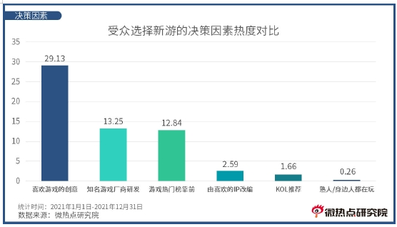 受眾在選擇新游戲時(shí),游戲創(chuàng)意會(huì)成為影響選擇的最重要因素。其次,游戲廠(chǎng)商、游戲熱門(mén)榜、IP改編等均是影響用戶(hù)選擇的因素之一。熟人推薦熱度僅為0.26,身邊人的推薦多通過(guò)面對(duì)面交流或較為私人的方式,公開(kāi)發(fā)布的網(wǎng)絡(luò)信息較少,故熱度相對(duì)較低。