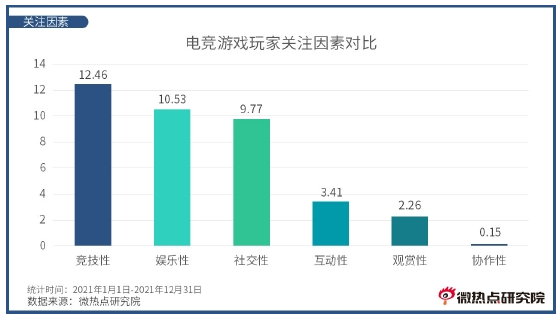 經(jīng)統(tǒng)計(jì),電競(jìng)中有關(guān)勝負(fù)的公平競(jìng)爭(zhēng)是能吸引玩家的重要因素,“競(jìng)技性”以12.46的熱度指數(shù)排在榜單榜首。其次,游戲帶來(lái)的娛樂(lè)性也是吸引用戶(hù)關(guān)注的因素之一。玩游戲附帶的社交性以9.77的熱度指數(shù)位列第三。