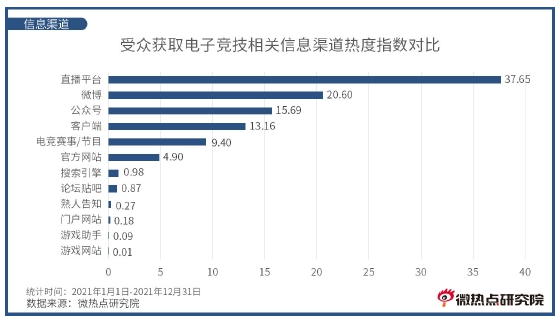 電競(jìng)愛(ài)好者選擇獲取電競(jìng)信息的渠道存在差異。據(jù)微熱點(diǎn)研究院統(tǒng)計(jì),2021年度,“直播平臺(tái)”以37.65的熱度指數(shù)位于信息渠道首位;“微博”“公眾號(hào)”“客戶(hù)端”分別以20.60、15.69、13.16的熱度指數(shù)位列第二、三、四位,三大平臺(tái)同樣是電競(jìng)用戶(hù)獲取電競(jìng)相關(guān)信息的主要渠道。還有部分觀(guān)眾從“電競(jìng)賽事/節(jié)目”了解電競(jìng)行業(yè)信息。