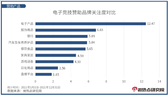 據(jù)知名數(shù)據(jù)及市場(chǎng)調(diào)研公司Newzoo統(tǒng)計(jì),2021年電競(jìng)收入中,來(lái)自贊助的占比達(dá)到59%,同比2020年上漲1.1個(gè)百分點(diǎn)。對(duì)電子競(jìng)技贊助品牌類(lèi)型進(jìn)行統(tǒng)計(jì),“電子產(chǎn)品”最受關(guān)注,王者榮耀手機(jī)贊助商iQOO,英雄聯(lián)盟電腦贊助商聯(lián)想拯救者、英特爾等品牌深度關(guān)聯(lián)游戲,釋出比賽助力活動(dòng)、人氣隊(duì)員評(píng)選、人氣戰(zhàn)隊(duì)評(píng)選等活動(dòng),帶動(dòng)熱度上漲。其次是“服飾用品”“銀行”“汽車(chē)及車(chē)用養(yǎng)護(hù)品”“餐飲食品”等不同行業(yè)的贊助品牌,四者熱度相差較小。