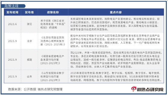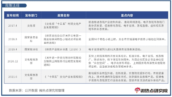 近年來(lái),政府高度重視文化產(chǎn)業(yè)的發(fā)展,陸續(xù)出臺(tái)一系列政策扶持文化產(chǎn)業(yè)建設(shè),其中,電競(jìng)作為現(xiàn)代新興文化產(chǎn)業(yè)的代表,政策關(guān)注度不斷提升。在國(guó)家層面上,2016年,國(guó)家體育總局在電競(jìng)領(lǐng)域引入運(yùn)動(dòng)員注冊(cè)制、國(guó)家文化部成立了“中國(guó)文化娛樂(lè)行業(yè)協(xié)會(huì)電子游戲競(jìng)技分會(huì)”?!丁笆濉睍r(shí)期文化產(chǎn)業(yè)發(fā)展規(guī)劃》和《“十四五”文化產(chǎn)業(yè)發(fā)展規(guī)劃》也明確提出要鼓勵(lì)發(fā)展電子競(jìng)技新業(yè)態(tài)、促進(jìn)電子競(jìng)技與游戲游藝行業(yè)融合發(fā)展。