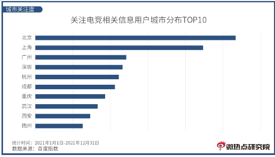 越來(lái)越多的城市開(kāi)始重視電競(jìng)產(chǎn)業(yè)的發(fā)展,并在政策、資源、資金等層面加大投入,大力扶持產(chǎn)業(yè)發(fā)展。以上海為例,英雄聯(lián)盟世界賽、王者榮耀KPL賽等眾多重量級(jí)核心賽事頻繁舉辦;騰競(jìng)體育、比心、火貓直播等企業(yè)扎根;EDG、RNG等俱樂(lè)部主場(chǎng)紛紛落地,共同助力上海打造“全球電競(jìng)之都”。在LPL、KPL等頭部賽事的帶動(dòng)下,中國(guó)的電競(jìng)城市版圖已從上海四散開(kāi)來(lái),如北京、深圳、重慶、武漢等扶持政策較多,電競(jìng)用戶(hù)也較為活躍的城市。從2021年關(guān)注電競(jìng)相關(guān)信息的用戶(hù)城市分布來(lái)看,一線(xiàn)及新一線(xiàn)的城市用戶(hù)討論熱情更高。