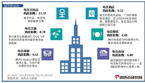 在政策及市場(chǎng)的加持下,電競(jìng)生態(tài)市場(chǎng)的輻射范圍愈加廣泛,實(shí)現(xiàn)了與更多場(chǎng)景的融合,孵化出多個(gè)生活新業(yè)態(tài)。其中“電競(jìng)?cè)沼闷贰弊钍荜P(guān)注,電競(jìng)外設(shè)、電競(jìng)椅等產(chǎn)業(yè)熱銷(xiāo),消費(fèi)者追求高品質(zhì)玩游體驗(yàn);“電競(jìng)酒店”以9.13的熱度指數(shù)排在榜單第二位,“電競(jìng)文旅”排在榜單第三位。電競(jìng)與多元豐富的場(chǎng)景連接,激活用戶(hù)體驗(yàn)的同時(shí),也為城市注入了新的活力與商機(jī)。