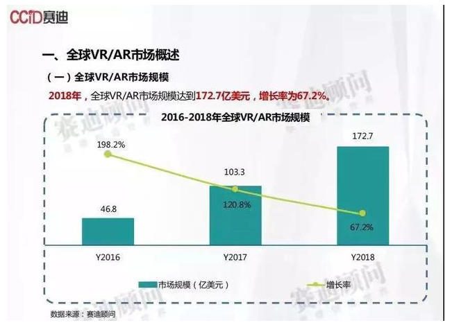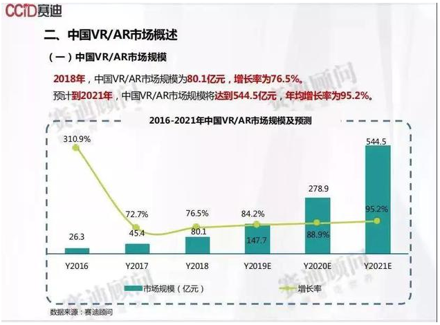 賽迪顧問此次還發(fā)布了《2018年VR/AR市場數(shù)據(jù)》,對全球VR/AR市場和我國VR/AR市場做了概述,并分析了我國的3個(gè)VR/AR細(xì)分市場,預(yù)計(jì)中國VR/AR規(guī)模將達(dá)到544.5億元,年均增長率95.2%。