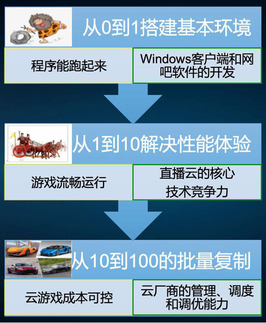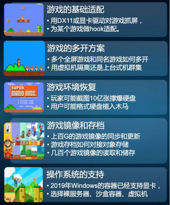 在0到1的階段,要解決云游戲運行環(huán)境問題。我們搭出云游戲原型,只進行500路以下的免費試運營,根據(jù)初步體驗反饋去摸索運營推廣測試,當前的目標就是讓云游戲基本跑起來。無論是挖一個40多歲的傳奇程序員,還是拿著微軟官方文檔去摸去砸,我們都要解決如下游戲運行環(huán)境的產(chǎn)研問題: