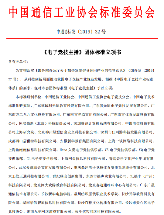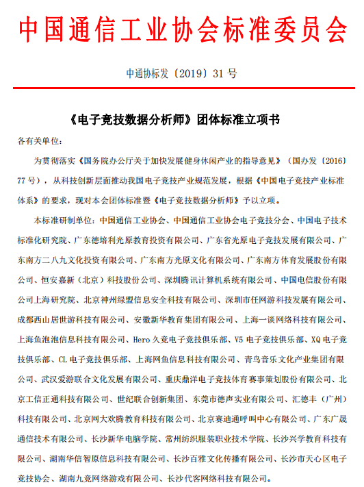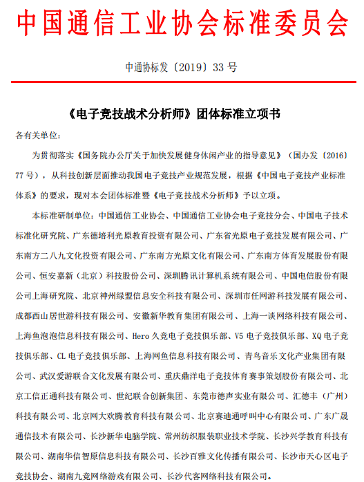 中通協(xié)標(biāo)發(fā)(2019)33號《電子競技戰(zhàn)術(shù)分析師》團(tuán)體標(biāo)準(zhǔn)立項(xiàng)書各有關(guān)單位:為貫徹落實(shí)《國務(wù)院辦公廳關(guān)于加快發(fā)展健身休閑產(chǎn)業(yè)的指導(dǎo)意見》(國辦發(fā)(2016)77號),從科…