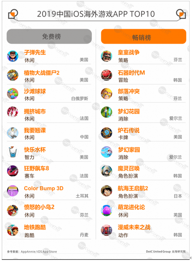 iOS App Store暢銷榜中的海外游戲包括消除、休閑和角色扮演等品類,主要來自日韓、愛爾蘭及美國(guó),其代表性產(chǎn)品分別有《夢(mèng)幻花園》《植物大戰(zhàn)僵尸2》和《魔靈召喚》等。