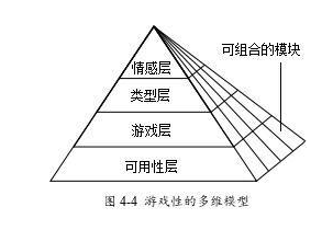 這個模型可以比較完整地表達游戲性的復雜性和多樣性。它是一個多維的模型,分為四層,每層中又包含不同的模塊。底層是可用性層,因為可用性是游戲性的基礎??捎眯詫又邪哪K就是我們前面介紹的可用性中客觀部分的各個子概念,如可學習性和可記憶性等。第二層是游戲層,包含了游戲性中的共性,也就是說不管什么類型都擁有的共性,如置入感等。第三層是類型層,也就是各個游戲類型所特有的具體的游戲性要素。對RPG來說,可以是魔法和戰(zhàn)斗系統(tǒng)參數(shù)設置。對RTS來說,可以是武器系統(tǒng)平衡性和微觀管理等。在類型層的上面,是情感層。它涵蓋了游戲性中所有主觀性的、模糊性的因素。
