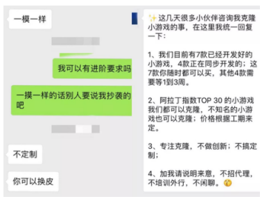但在這份聲明后發(fā)布的一個月內(nèi),業(yè)內(nèi)人士均表示小游戲的抄襲、甚至是克隆現(xiàn)象并沒有得到強力的遏止,有關(guān)克隆的囂張廣告出現(xiàn)在了上百個小程序的群聊中。