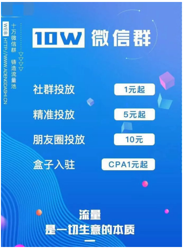 市面上的流量公司分為兩類。第一類以純推廣,即分享為主,不含注冊用戶,不保證點擊量,這被稱為CPC模式。主要的方式有:社群投放(普通群聊)、精準(zhǔn)投放(目標(biāo)人群聊,例如學(xué)生群、寶媽群、一線城市群等)、朋友圈投放和盒子入駐。價格根據(jù)具體的分享數(shù)量而定,不同方式,單價不同。