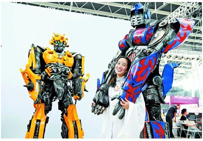 動漫游戲愛好者與變形金剛模型群組合影。新華社發(fā)
