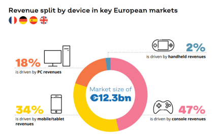 在新的年度《Key Facts 2019》初版刊物中,ISFE發(fā)現(xiàn)在四個(gè)主要的歐盟市場(chǎng)(法國(guó)、德國(guó)、西班牙及英國(guó)),主機(jī)游戲的收入占了47%。
