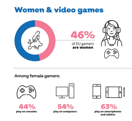 ISFE的數(shù)據(jù)還顯示全部的歐盟游戲玩家有46%為女性。其中又以移動(dòng)設(shè)備最受女性玩家的青睞(占63%),PC和主機(jī)緊追在后,分別為54%和44%。