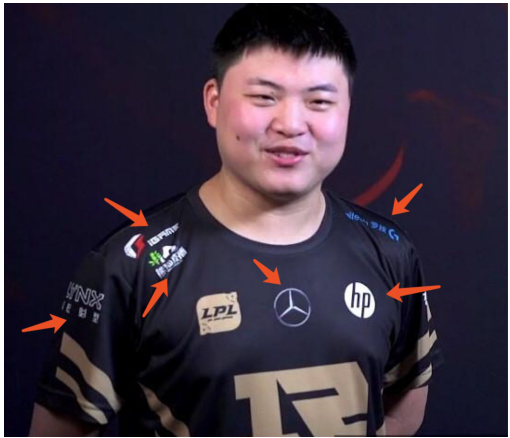 贊助最直接的表現形式便是選手服裝上的LOGO展示,以今年代表中國LPL出戰(zhàn)的三支戰(zhàn)隊為例,服裝上除了印有戰(zhàn)隊的logo外,各大企業(yè)商標幾乎隨處可見。