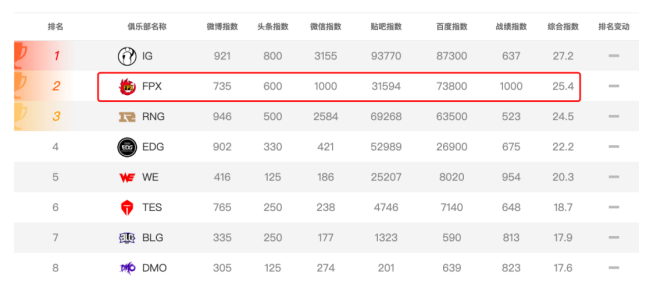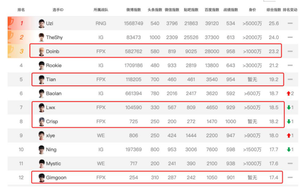 對于贊助商而言,選擇贊助戰(zhàn)隊無疑是一場激進的賭博,如今FPX奪冠,從品牌曝光收益來看,FPX帶來的傳播價值或遠遠高于贊助商的贊助費用。目前,在戰(zhàn)隊價值排行榜上,FPX位列第二,戰(zhàn)隊成員排名也有所上升。