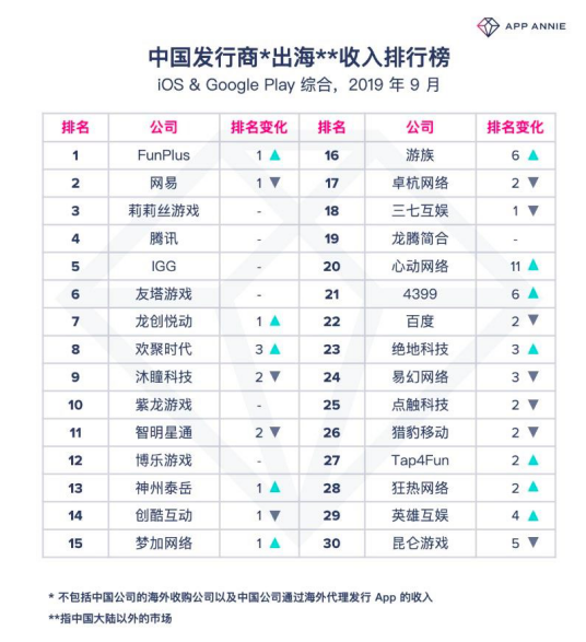 在2019年9月中國發(fā)行商出海收入排行榜TOP30中,FunPlus更是超越網易騰訊等游戲大廠位居榜首。