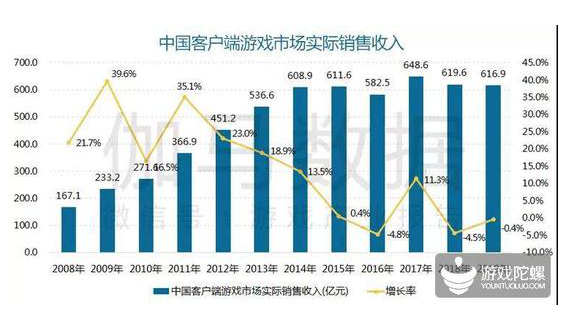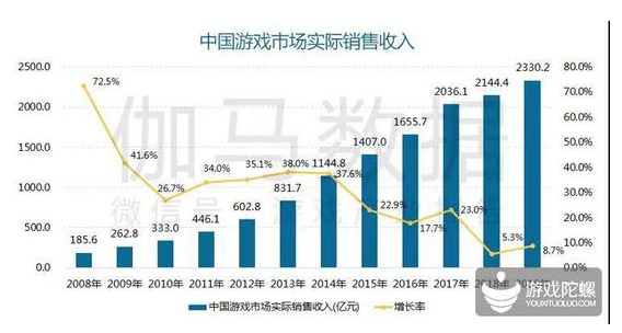 2019年,中國游戲市場實際銷售收入2330.2億元。增速為8.7%,較去年增速有所回升,這主要受益于移動游戲市場實際銷售收入增速保持平穩(wěn),而客戶端游市場實際銷售收入同比下降幅度收窄。