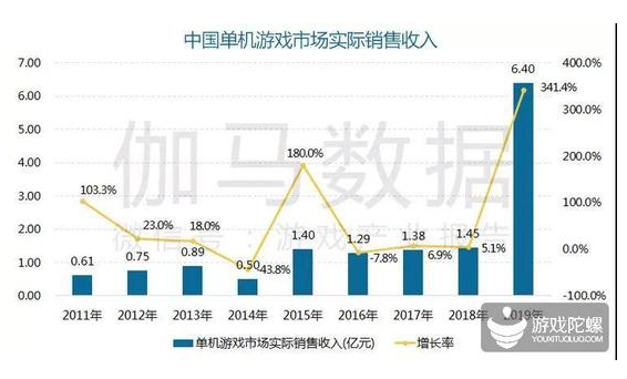 2019年,中國單機游戲市場實際銷售收入大幅上漲達到6.4億元,同比增長341.4%。這主要受益于單機游戲發(fā)行平臺的不斷成熟;同時,一些單機新品不斷推出,也推動了銷售收入的增長。