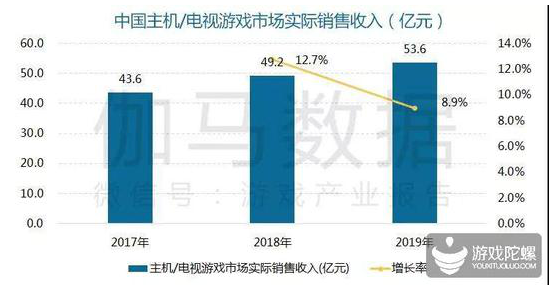 2019年,中國主機/電視游戲市場實際銷售收入達53.6億元,穩(wěn)定增長。