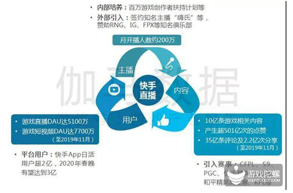 以快手為例,快手本身具備用戶優(yōu)勢,短視頻業(yè)務日活用戶達到數(shù)億人次,且這一類用戶與游戲直播用戶具備較高重合度。借助于用戶基礎,快手從數(shù)百萬主播中扶持培養(yǎng)游戲主播,再借助于主播產(chǎn)生的內容聚合用戶,快速形成了游戲直播的社區(qū)氛圍。此外,快手短視頻也促進了主播游戲視頻的傳播,進而沉淀了更多游戲直播用戶,并形成了短視頻與游戲直播業(yè)務的聯(lián)動發(fā)展。未來快手還圍繞內容環(huán)節(jié)在直播培養(yǎng)、引入、賽事轉播和主辦等方面進行深入的內容布局,進而獲取更多的游戲直播用戶,并為短視頻業(yè)務提供更多的優(yōu)質原創(chuàng)內容。