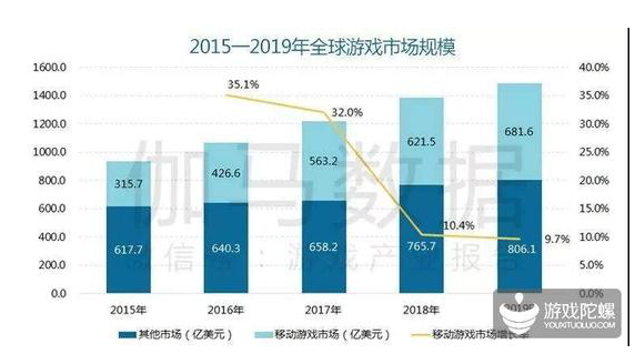 2019 年全球游戲市場收入預計達到1488億美元,其中移動游戲市場占比最高且市場規(guī)模穩(wěn)定增長,市場收入預計達到681.6億美元,同比增長9.7%。隨著5G技術的落地及智能機普及率的提升,未來移動游戲市場在全球范圍內仍具備較高的拓展空間。