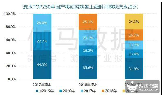 伽馬數(shù)據(jù)研究發(fā)現(xiàn),從近年流水TOP250產(chǎn)品中各上線時間產(chǎn)品流水占比可以發(fā)現(xiàn),每年的新產(chǎn)品流水占比均在25%左右,而2015以前上線的老產(chǎn)品流水占比雖出現(xiàn)明顯縮減,但占比仍居首位。伽馬數(shù)據(jù)通過追蹤具體產(chǎn)品發(fā)現(xiàn),每年進入流水TOP250的新品中,研發(fā)創(chuàng)新明顯,如玩法創(chuàng)新、美術效果創(chuàng)新、題材創(chuàng)新等;而老產(chǎn)品在運營維護上創(chuàng)新手段則更多。借此可推斷企業(yè)在研發(fā)運營等方面的創(chuàng)新行為一定程度上影響著市場中新老產(chǎn)品的流水表現(xiàn)。