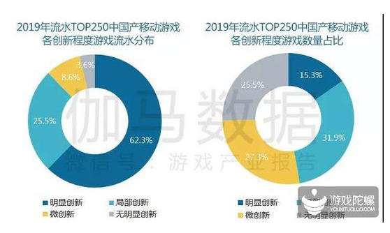 為更清晰地分析創(chuàng)新給企業(yè)產(chǎn)品帶來的變化,伽馬數(shù)據(jù)將產(chǎn)品創(chuàng)新力評分分級劃分為4個創(chuàng)新程度,可以發(fā)現(xiàn)在明顯創(chuàng)新程度的產(chǎn)品數(shù)量占比僅有15.3%,但流水占比卻達62.3%,這也說明了產(chǎn)品創(chuàng)新力直接影響著其流水收益。