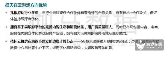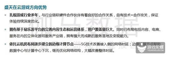 2014年,場景服務商盛天網(wǎng)絡正式布局云計算領域,由于其主營業(yè)務圍繞游戲產(chǎn)業(yè)及網(wǎng)吧場景,因此其重心更偏向于游戲及相關服務方向。云游戲方面,盛天網(wǎng)絡于2017年開始籌備相關項目,目前隨樂游云游戲平臺已經(jīng)搭建完成。盛天云游戲各端口硬件方案基準測試顯示,其技術指標已實現(xiàn)省內網(wǎng)絡延遲在0~25毫秒,畫質可達1080P,60幀,達到操控情況與本地鍵鼠操作體驗無明顯差異。帶寬占用方面,根據(jù)用戶各種畫質選擇動態(tài)調節(jié),可達到最低5Mbps,最高20Mbps。2019年11月平臺于中國游戲節(jié)上再次亮相,盛天網(wǎng)絡通過反復測試、持續(xù)優(yōu)化,平臺性能不斷提升,用戶向邀請測試目前反饋良好。