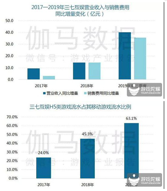 三七互娛在營銷與平臺運營等方面創(chuàng)新力評分居高。在營銷方面,三七互娛的創(chuàng)新力主要體現(xiàn)在科學營銷辦法上?;谌呋蕦τ螒騼葦?shù)值體系的沉淀、流水轉化效果的掌握,使得三七互娛可以制定出更能切合產(chǎn)品的推廣策略,多產(chǎn)品能夠爆發(fā)出高流水,并以低維護費用長線獲利,近年三七互娛銷售費用與營業(yè)收入的同比增量可以一定程度驗證其營銷方法的有效性,而營銷長尾效應將帶來更高的利潤回饋。在平臺運營創(chuàng)新方面,三七互娛在H5技術流行早期便在研發(fā)上布局了這一新領域,通過更多平臺流量覆蓋、便捷玩法等優(yōu)勢實現(xiàn)了收益提升。伽馬數(shù)據(jù)產(chǎn)品流水監(jiān)測顯示,H5類游戲已經(jīng)成為三七互娛近年流水占比較高的產(chǎn)品類型,這也證實了這種適用于H5平臺的小包體創(chuàng)新打法的可行性。