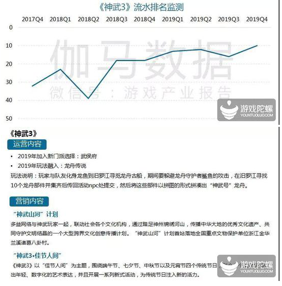 多益網(wǎng)絡在運營、營銷方面創(chuàng)新力評分居高。2019年,多益網(wǎng)絡旗下《神武3》流水在國內移動游戲市場中始終保持長效增長,運營與營銷的維穩(wěn)及用戶拓展起到關鍵作用。近年來《神武3》平均半年進行一次大的版本更新,2019年加入了“龍舟傳說”玩法、新門派武侯府等內容,長期為用戶提供新鮮的游戲體驗;同時《神武3》強調社交元素,營銷交互中也圍繞這一核心,2019年進行過數(shù)次音樂、非遺、傳統(tǒng)節(jié)日文化等線上線下跨界聯(lián)動的文創(chuàng)活動。