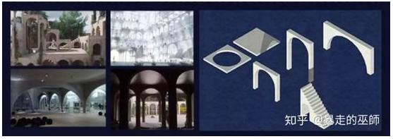 根據(jù)偶像的名言,想利用這些參考圖制造出場景白模進(jìn)去走走,因此將所尋找到的參考圖片解構(gòu)為可用的一木一石,我們何妨做做這一木一石呢?所以零碎事通常都是我來做,我就根據(jù)參考圖中的拱結(jié)構(gòu)大致區(qū)分為幾個(gè)可用的對(duì)象,為了滿足這些對(duì)象可以通用,所以改變了些尺寸比例,當(dāng)中自然可以發(fā)現(xiàn)伊東的多摩藝術(shù)大學(xué)圖書館的結(jié)構(gòu)方式較為繁復(fù),并不適用于此次的內(nèi)容,因此有了較多的簡化。