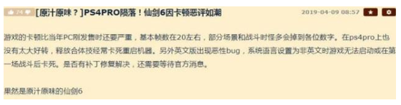 其次就移植平臺(tái)的優(yōu)化,還是拿“仙6”做案例,都知道“仙劍”作為情懷IP一定會(huì)想辦法吃足自己最后遺留的一點(diǎn)念想,于是做了PS4平臺(tái)移植,至于這個(gè)移植的表現(xiàn)如何,能讓PS4首發(fā)期的玩家自嘲買了個(gè)假的PS4PRO就可以看出來了,游戲中基本也就能跑到20幀,而且還經(jīng)常卡死讓機(jī)器重啟,而戰(zhàn)斗時(shí)候怪物一多幀率甚至?xí)舻絺€(gè)位數(shù)。